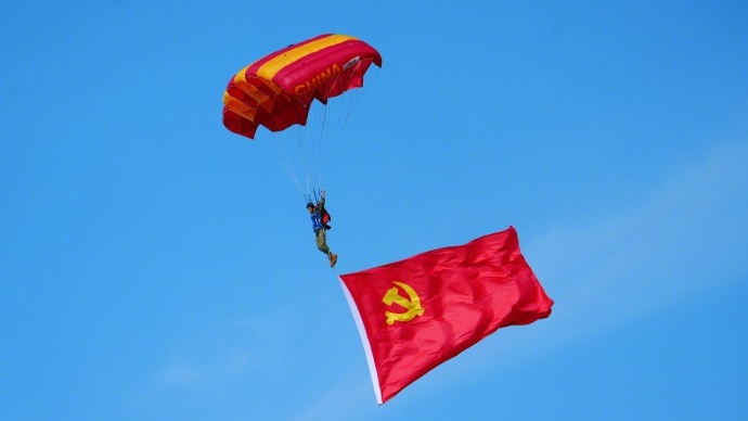 “八一”跳伞队与“蓝鹰”跳伞队共同演绎精彩跳伞表演,蓝鹰