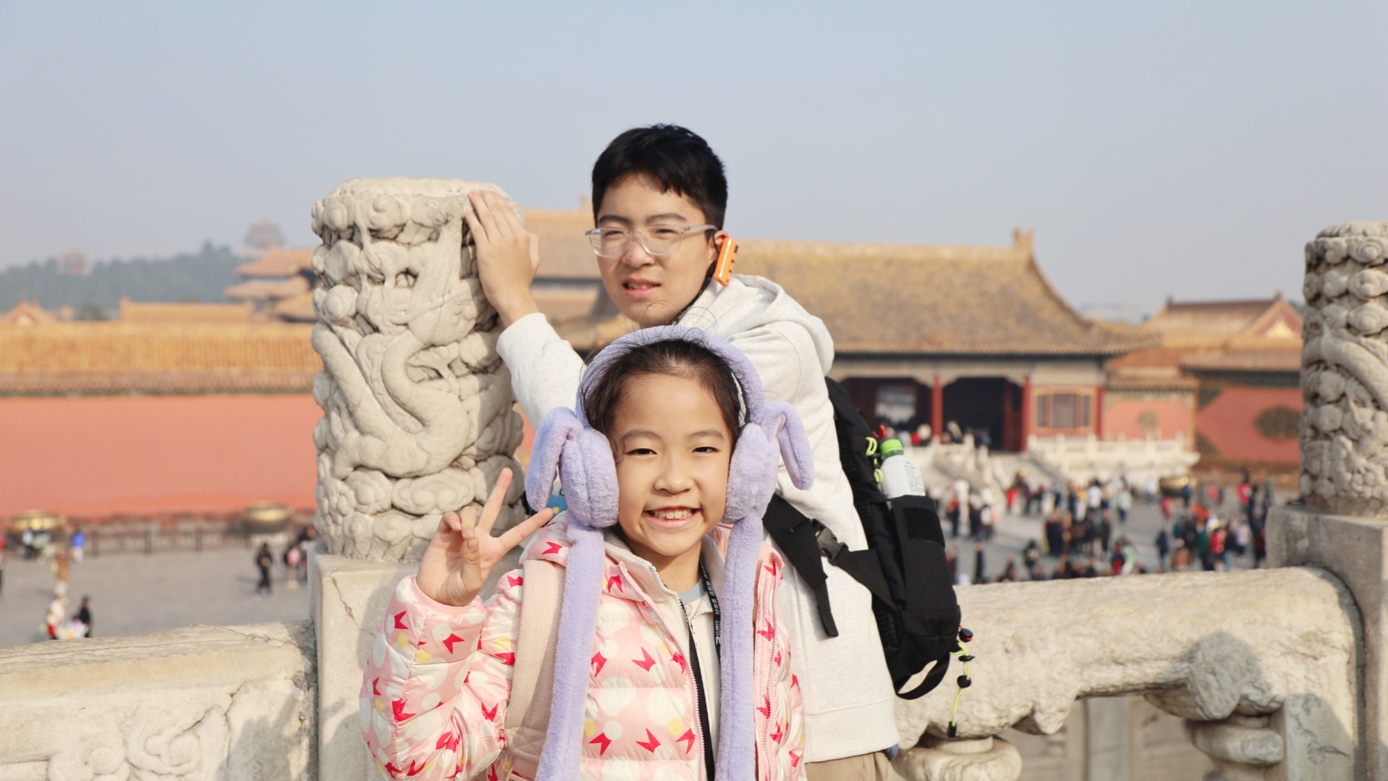 宁波的蔡先生带着他的孩子在北京故宫博物院度过了愉快的假期。玩起来就能尽情享受。可以看到许多学生混杂在人群中。反映出家长对假期价值的新审视——无论是长途旅行还是近郊游,”