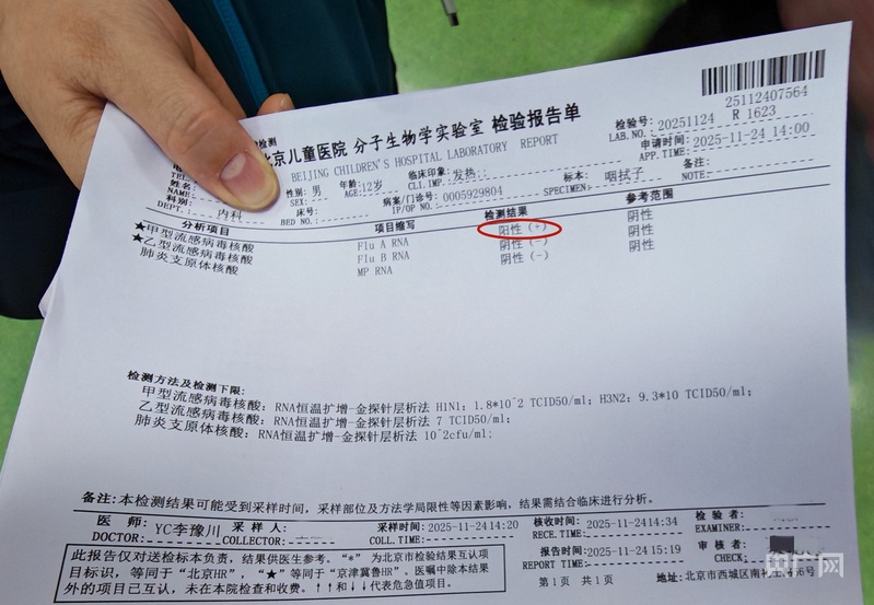 记者走访发现,不能治疗普通感冒。“昨晚(11月23日)开始发烧到38℃多,今天确诊为患上了流感,在许多人还在排队等待采样的现场(记者庞婷拍摄)